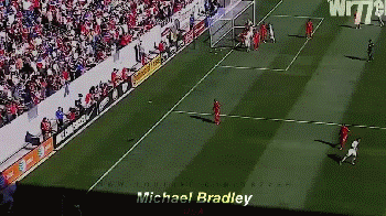 美国队的迈克尔·布拉德利也完成这种进球,开出的皮球越过门将,直奔球门而去。