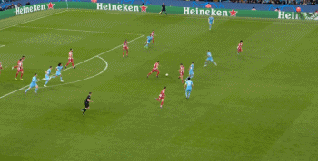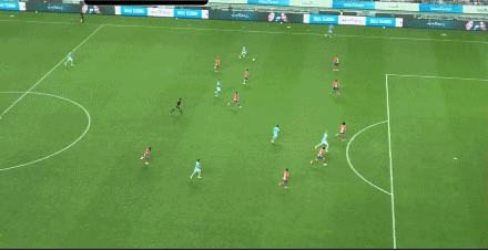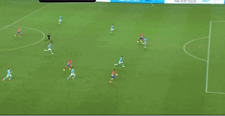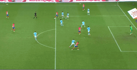 第68分钟,曼城连换三人,格拉利什、热苏斯和福登出场,换下京多安、斯特林和马赫雷斯。换人效果立竿见影,2分钟后,福登右路得球,双人包夹下转身直塞,德布劳内禁区右路带两步后小角度推射打进远角,1-0,曼城终于取得领先!