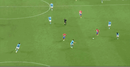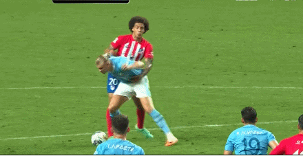 马竞对哈兰德采取强硬的贴身拉拽防守,第40分钟,哈兰德控球试图转身,维特塞尔硬是拉住魔人布欧,不让其突破成功。曼城主控,马竞主守,双方踢得非常认真专注。