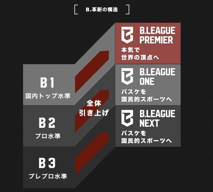 此前B1、B2和B3的分级改名为B.LEAGUE PREMIER、B.LEAGUE ONE和B.LEAGUE NEXT,三个级别的联赛管理公司将统一为B Innovation,并且给不同的分级联赛制定了目标。