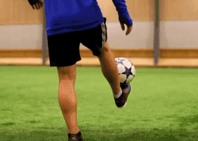 关键是微抬脚踝,不要让皮球自然地落到你的脚面。