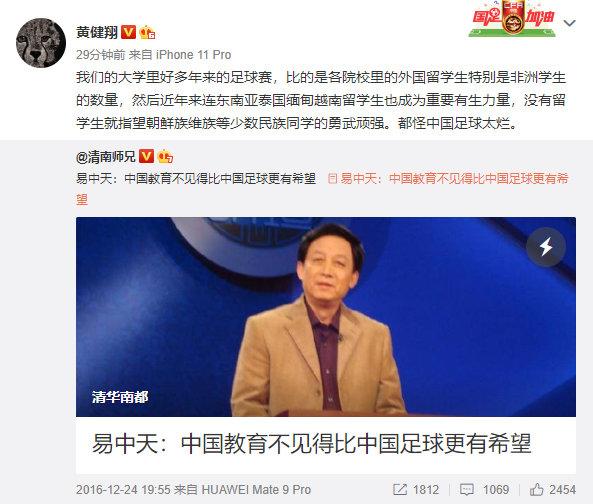 黄健翔也做出了回应,他在微博上转发了有关易中天教授谈中国教育不见得比中国足球更有希望相关的文章,并配文写道:“我们的大学里好多年来的足球赛,比的是各院校里的外国留学生特别是非洲学生的数量,然后近年来连东南亚泰国缅甸越南留学生也成为重要有生力量,没有留学生就指望朝鲜族维族等少数民族同学的勇武顽强。都怪中国足球太烂。”,疑似回应有关中国教育和中国足球的话题。