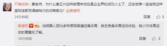 在回复网友有关美团CEO王兴言论的问题时,黄健翔也表示:“说明国人因为多种原因普遍远离体育,缺乏亲身体育运动体验,缺少对体育运动的尊重和了解。”