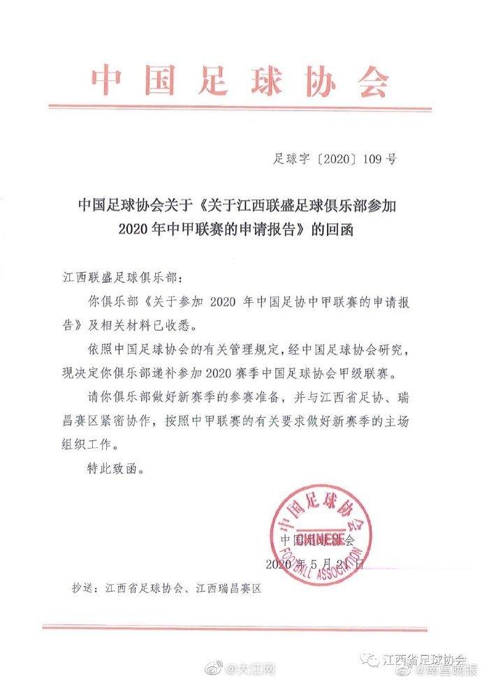 【江西足球再传喜讯:时隔5年江西联盛重回中甲!】5月23日中午,中国足协在官网公布了2020赛季中国三级职业联赛的参赛名单。其中,不出大家所料,江西联盛足球俱乐部递补中甲成功。与江西联盛同时递补中甲的还有苏州东吴、四川优必选、昆山FC三支球队。另外,深圳佳兆业也成功递补中超。由于在本周五下班前,中国足协都没有公布三级职业联赛准入名单,外界一致猜测可能又要延到下周了。这也导致在周六中午公布这一消息,让很多人措手不及。