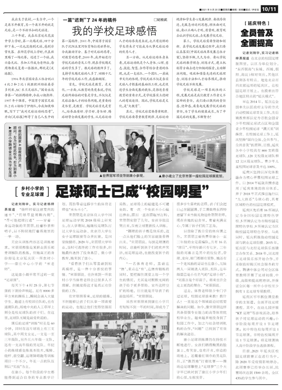 在校园足球方面开展“拔尖”的北京延庆康庄中心小学也应邀参会,该学校的校园足球工作得到了社会各界的广泛关注,教育部、体育总局、中国足协等单位领导多次到校指导。该校校长纪桂武接受记者采访时表示,这样的研讨会举办得很好,能够给全国校园足球的发展提供指导意见,能够带动更多的学校更好地开展校园足球活动。