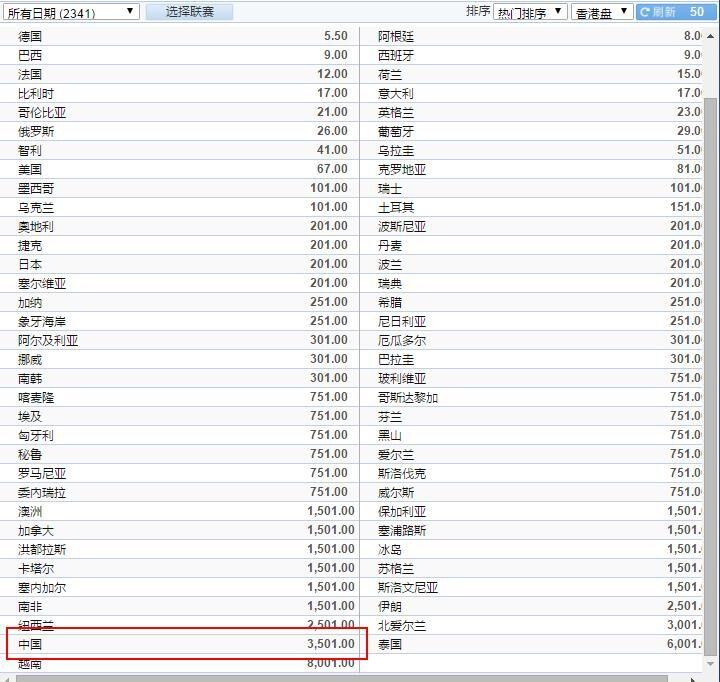 40强赛第9轮开始之前,国足的夺冠赔率低至137.25,在全球所有球队中排名第20位。要知道当时国足晋级12强赛的前景都岌岌可危,博彩公司开出这样的赔率也令所有人大跌眼镜。
