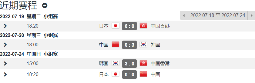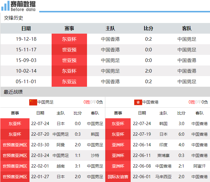 第一:两队情况 !东亚杯前2轮战罢,中国男足1平1负,先是0-3惨败给韩国队,再是0-0逼平日本队;中国香港男足遭遇两连败,分别0-6输给日本和0-3输给韩国。