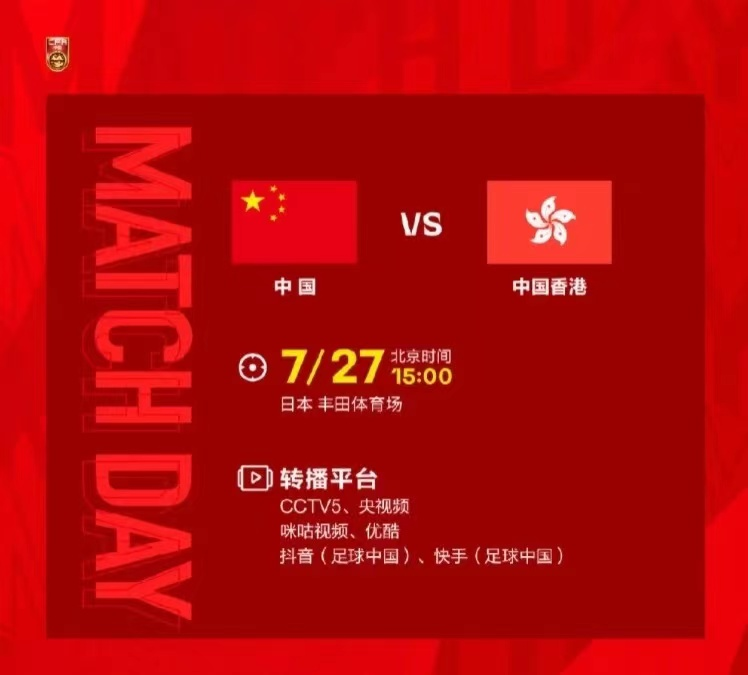 北京时间7月27日下午15时 ,中国男足在本届东亚杯上迎来最后一场比赛,将在日本丰田体育场对阵中国香港男足,央视CCTV5将会直播本场比赛。