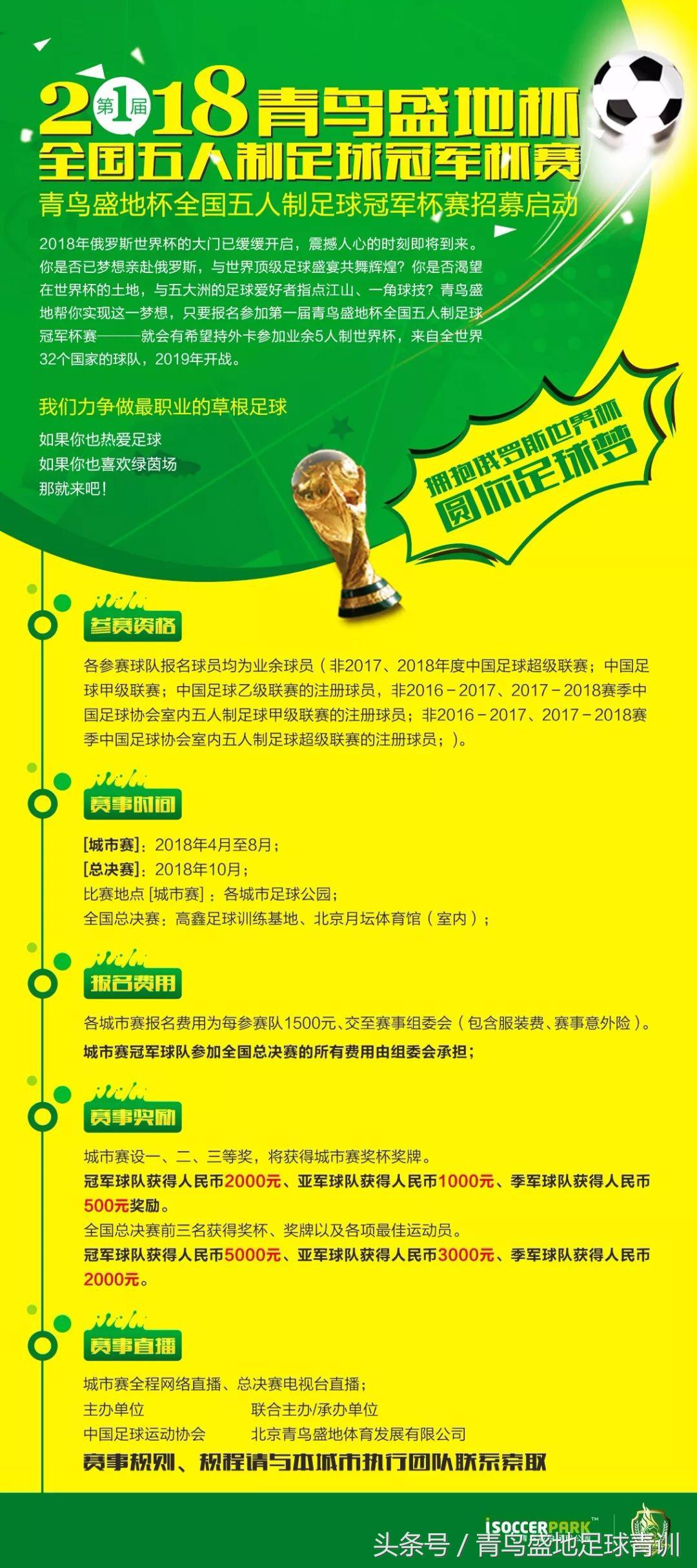 为促进业余足球运动的发展,打造健康向上的草根足球赛事,首届青鸟盛地杯全国五人制足球冠军杯赛将于今年4月鸣锣开战。本项赛事将分为城市赛和总决赛两个阶段,城市赛将从4月持续到8月,在全国8个赛区同时开赛。各赛区的冠军队将于10月齐聚北京,进行全国总决赛,决出总冠军。