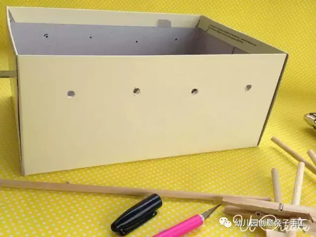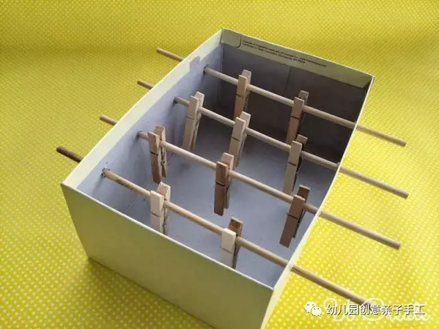 1.选择10个木夹子作为球员小选手。两个守门员在两端,中间三个人。根据夹子的高度在鞋盒上打孔(高度需要比夹子高一些)