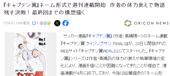 ·在今年4月,《足球小将》作者高桥阳一就宣布由于身体的原因,虽然不算烂尾,但本作已经正式完结,不过另外宣布今后将以“构思原图”的形式来继续创作,完成自己的关于本作的最终构想。