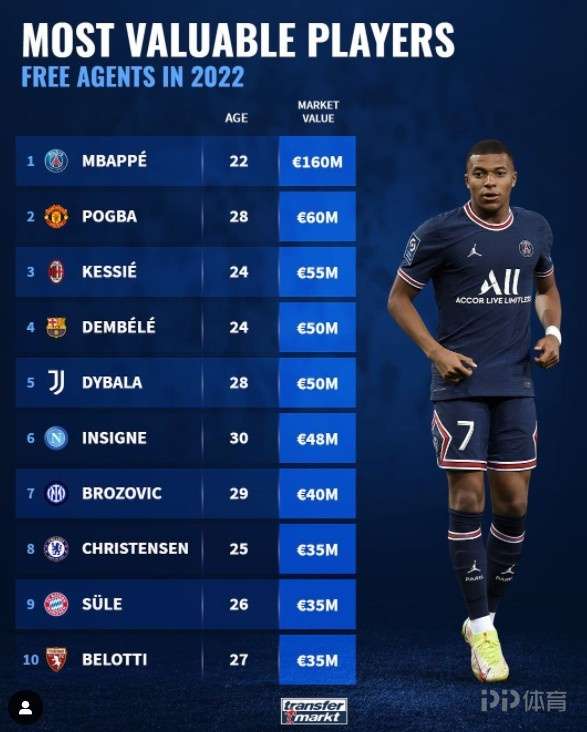 根据德国转会市场的数据统计,合同将在2022年到期的球员身价榜中,姆巴佩以1.6亿欧元的身价,排在首位。