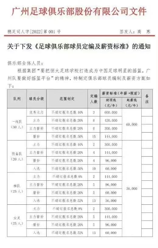 不过在2月16日,市场流出一分广州足球队俱乐部红头文件,确定俱乐部球员最新薪资标准。在文件中,一线主力球员(30人)底薪是6万元/年,最高封顶60万元/年。
