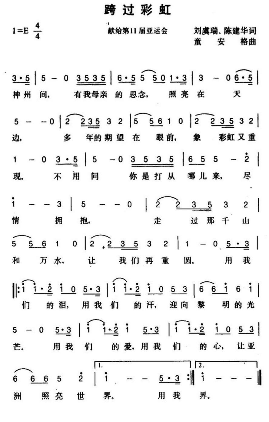 这是一首童安格专门为九零年北京亚运会写的“跨过彩虹”,也许这是童安格最大气的一首歌。北京音乐台的DJ陆灵涛曾经在他的非常有名的栏目“老式汽车”里说,也许这首“跨过彩虹”写出来比较晚,或者因为不是大陆音乐人创作的,否则大概北京亚运会的主题歌就不是“亚洲雄风”了。