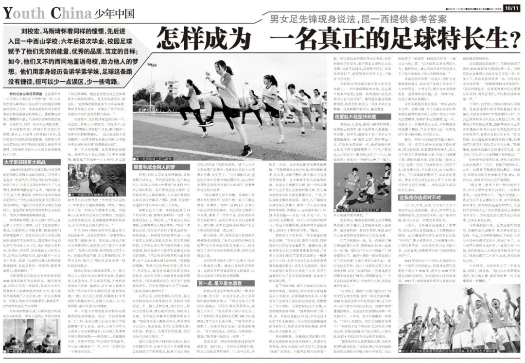 小升初、中考、高考,几乎每个人至少要面对这三道选择题。那么,体育特长生有哪些选项,应该如何作答?这一系列问题,都可以从昆一西找到参考答案。小学时,马斯琦幸运地遇上了李雪荭,刘校宏则在金康园遇上了启蒙教练许晓明。出自鲁能青训的后者有条自己的“弟子规”:期末成绩不佳,立刻清理出队。正因后果严重,刘校宏在学习上不敢大意。在他看来,许晓明其实是“用足球督促我学习”。