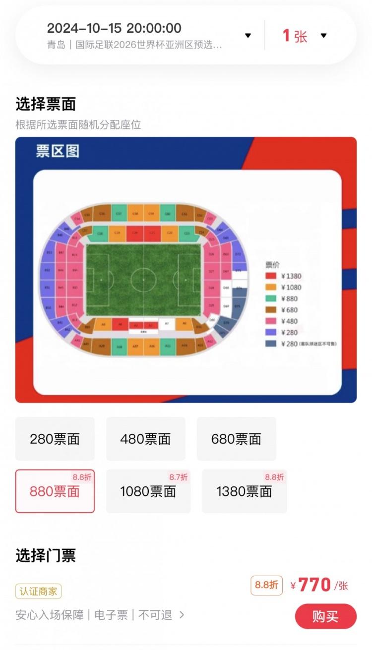 某购票平台小程序显示,今日原定价880元、1080元和1380元的三档球票开始享受折扣,其中1380元档打8.7折,另外两档打8.8折。以880元档为例,在打折后仅需770元即可购买,较原价低110元。
