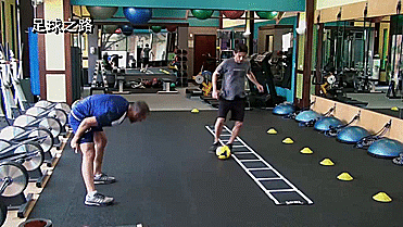 我们从敏捷梯一侧大跨步进入敏捷梯,然后大跨步跳出,每次跳出敏捷梯要稳再开始下一轮动作,同样是做五组,组间休息30秒。