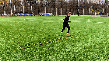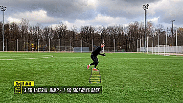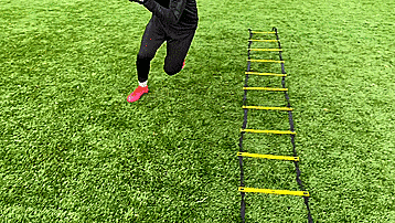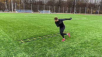 第三个训练是横向两步加单脚跳跃,我们从敏捷梯一端开始。