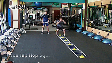 我们首先单脚大跨步跳入敏捷梯,然后脚不落地,向敏捷梯外一个小跳,再跳回,最后一个大跨步跳跃,抬起的脚落地,不断重复这个动作,我们做五组,组间休息30秒。