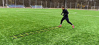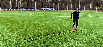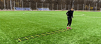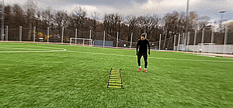 第二个训练是腾空剪刀脚加箭步跳,我们同样从敏捷梯的一端开始。