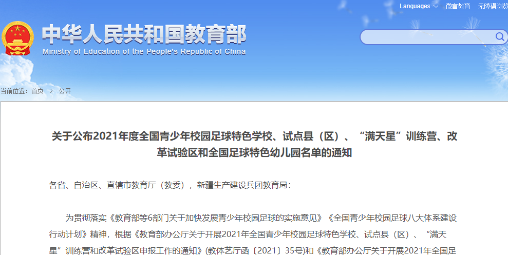 2月14日,教育部公布2021年度全国青少年校园足球特色学校、试点县(区)、“满天星”训练营、改革试验区和全国足球特色幼儿园名单。经有关单位自主申报、省级教育行政部门审核推荐、专家复核评审与社会公示,教育部认定并命名全国青少年校园足球特色学校2038所、全国青少年校园足球试点县(区)40个、全国青少年校园足球“满天星”训练营28个、全国青少年校园足球改革试验区5个和全国足球特色幼儿园2030所。