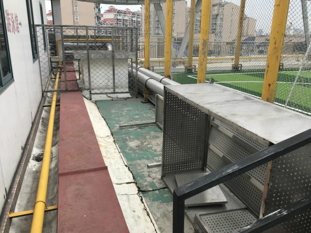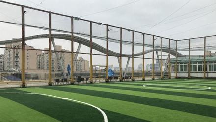 楼顶,空调、燃气、通风各色管道占据了通行道路,经营者不得不搭建楼梯绕过管道,进入球场并不算方便。足球场两侧球门后方,一侧靠近三湘世纪花城西区,空间也相对宽阔,摆上了几张玻璃台面和座椅,这里也是球场的唯一入口;另一侧紧邻逸仙高架路,一排大型空调冷却机占据了所有的空间,无法通行。整个足球场约400平方米,上方笼罩着一层带有破洞的网面,四周用钢结构支架和铁丝网包围,高度约有10米,顶部一共挂着12盏照明灯。记者留意到,钢结构略显陈旧,一些地方已出现外漆脱落生锈;但人工草坪却崭新鲜亮。至于其他配套设施,如更衣室、淋浴间、封闭式的休息空间,似乎都不具备。与足球场紧邻的还有一个游泳馆,已停用多年。