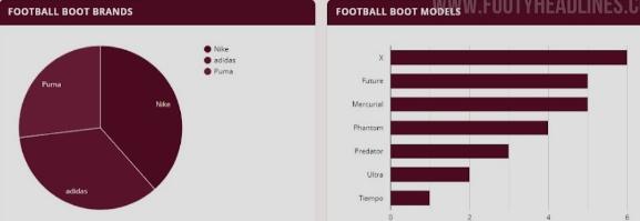 如果我们仅看球队的首发十一人,你会发现NIKE占据了主导的地位,首发十一人中,有7名球员选择了NIKE,PUMA和ADIDAS则各有2名球员。