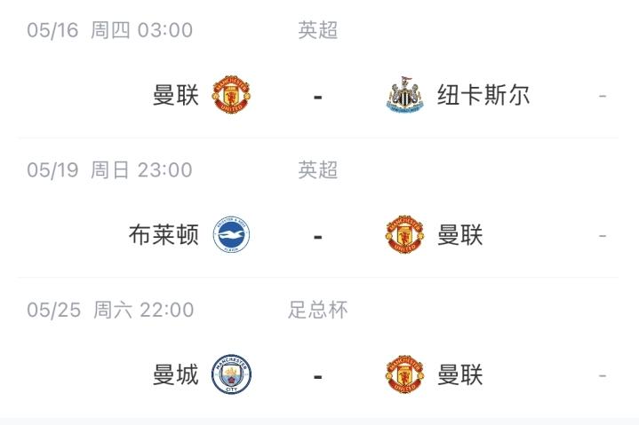 曼联本赛季英超还剩下3场比赛,对手分别是阿森纳、纽卡斯尔联和布莱顿。