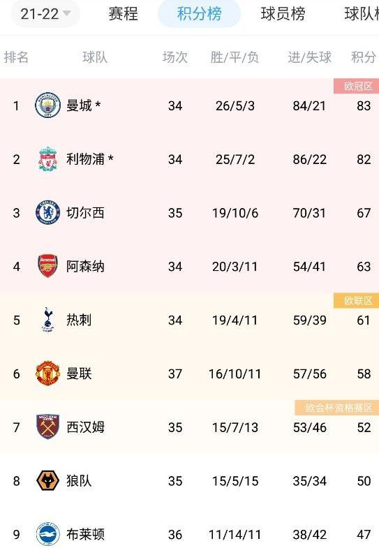 曼联本轮先开赛,目前37轮积58分排名英超第6位,阿森纳比曼联少赛3场目前积63分排第四。