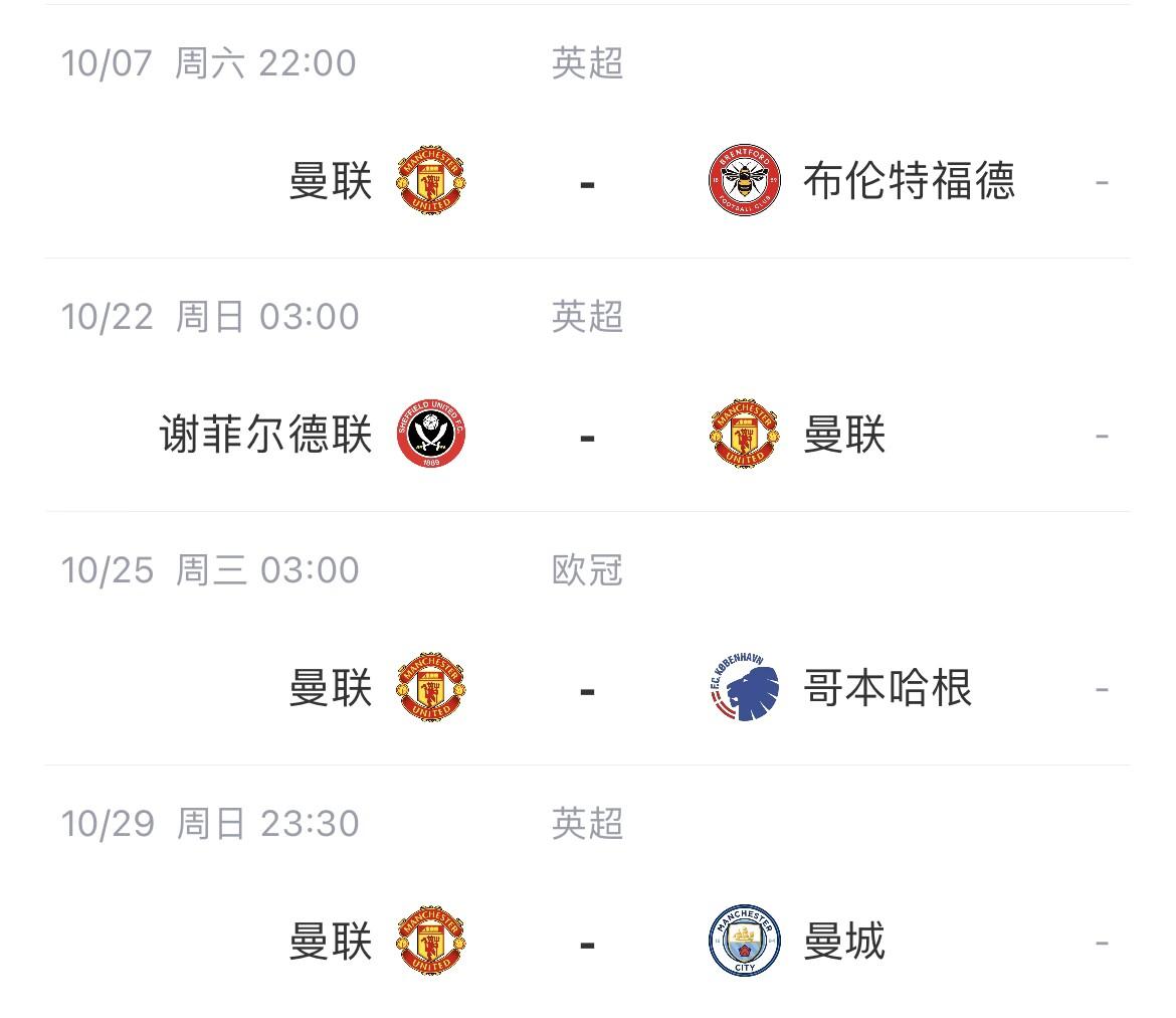 曼联10月还剩4场比赛,其中3场英超月底将对阵曼城,欧冠则是主场对阵哥本哈根。