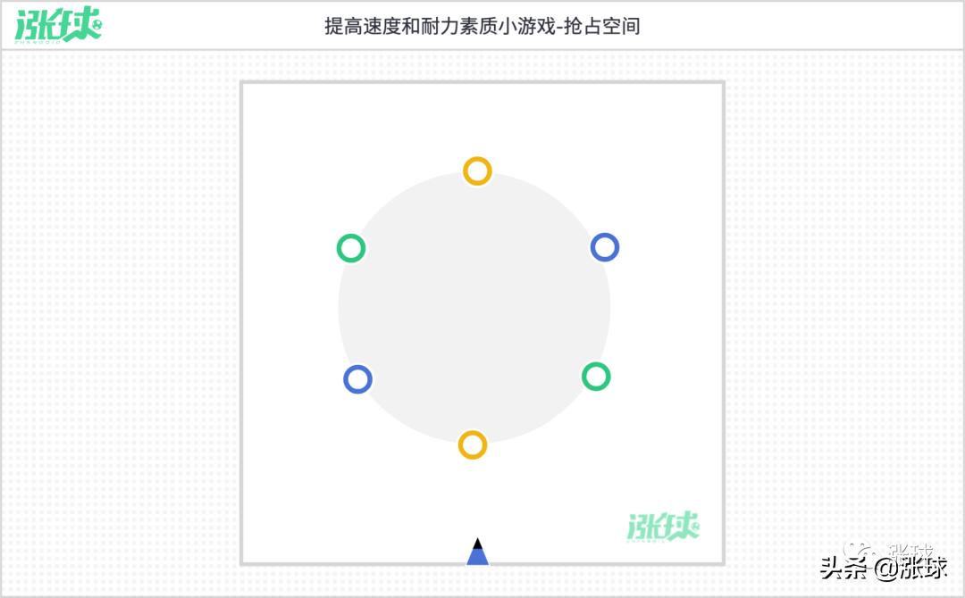 可以通过增加跑的圈数增加游戏难度根据球员年龄和能力调整圆圈大小,要使追赶的队员有机会追上运球的队员动态演示