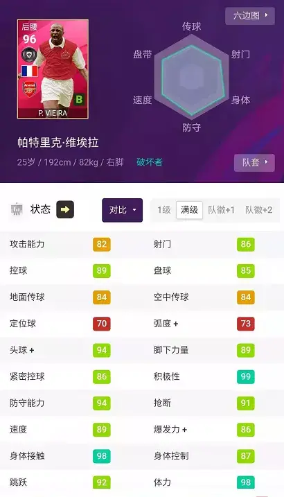 维埃拉 --- 其实他根本不需要怎么介绍了 公认的 第一大铁腰,防守强悍,综合实力最强后腰。 他2张卡上面的是25岁卡 速度更快些 头球更好些, 还有个是27岁卡 那个传球和抢断数据高些,个人还是推荐 速度更快的这张卡。