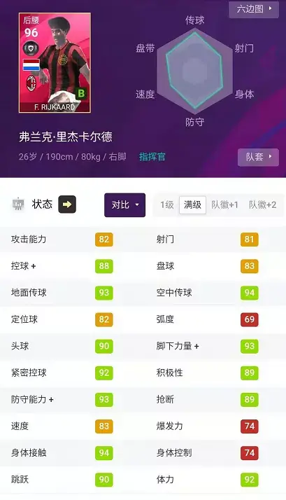 里杰卡尔德绰号“黑天鹅”,作为一名后腰,他的防守相当稳健可靠,奔跑快速,拼抢勇猛,动作强悍,是前后攻防的枢纽。除了防守能力之外,作为一名后腰,他有着92分的紧密控球和93+的双传,出色的传球属性让他可以成为球队反攻的发起者,精准一传掉转攻守!里杰卡尔德也有着强大的身体素质,94分的身体接触赋予了他不俗的对抗能力,提高了他的防守强度。如果同时拥有维埃拉和他组合双后腰,那防守更加强悍有硬度。