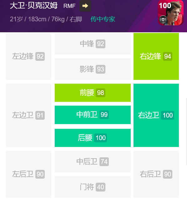 例如边前卫会非常压分,皮雷的数据放到左边锋,总评可以达到97,小贝拿到后腰,总评也会提高不少(这点国服已经体现了),所以总评只是一个参考数值,不必拿总评看球员。