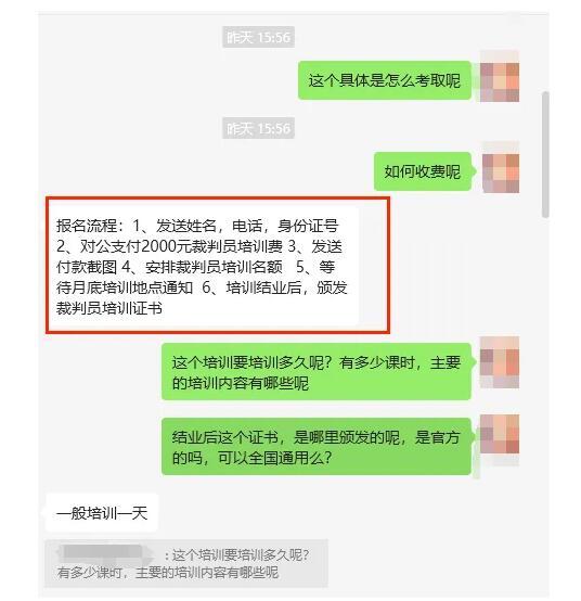 “培训费用是980元,确保你拿到证;我们的裁判证群里有各地的裁判、赞助商等,他们都将是你十几个城市的‘朋友’。”李淮表示。