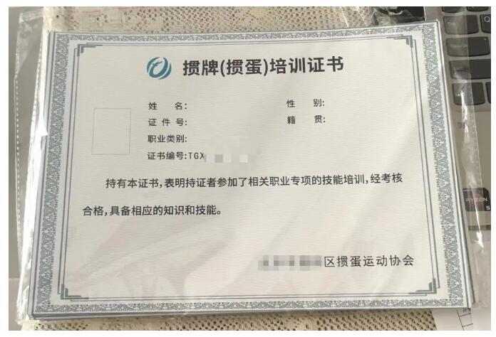 相比起上千元的培训费,培训者最关心的当属证书的“正规性”和未来在市场上的“流通性”。李淮解释称:“我们证书盖的是淮安掼蛋协会的章,照片位置有钢印,唯一不同的是下面没有‘国家体育总局监制’。”