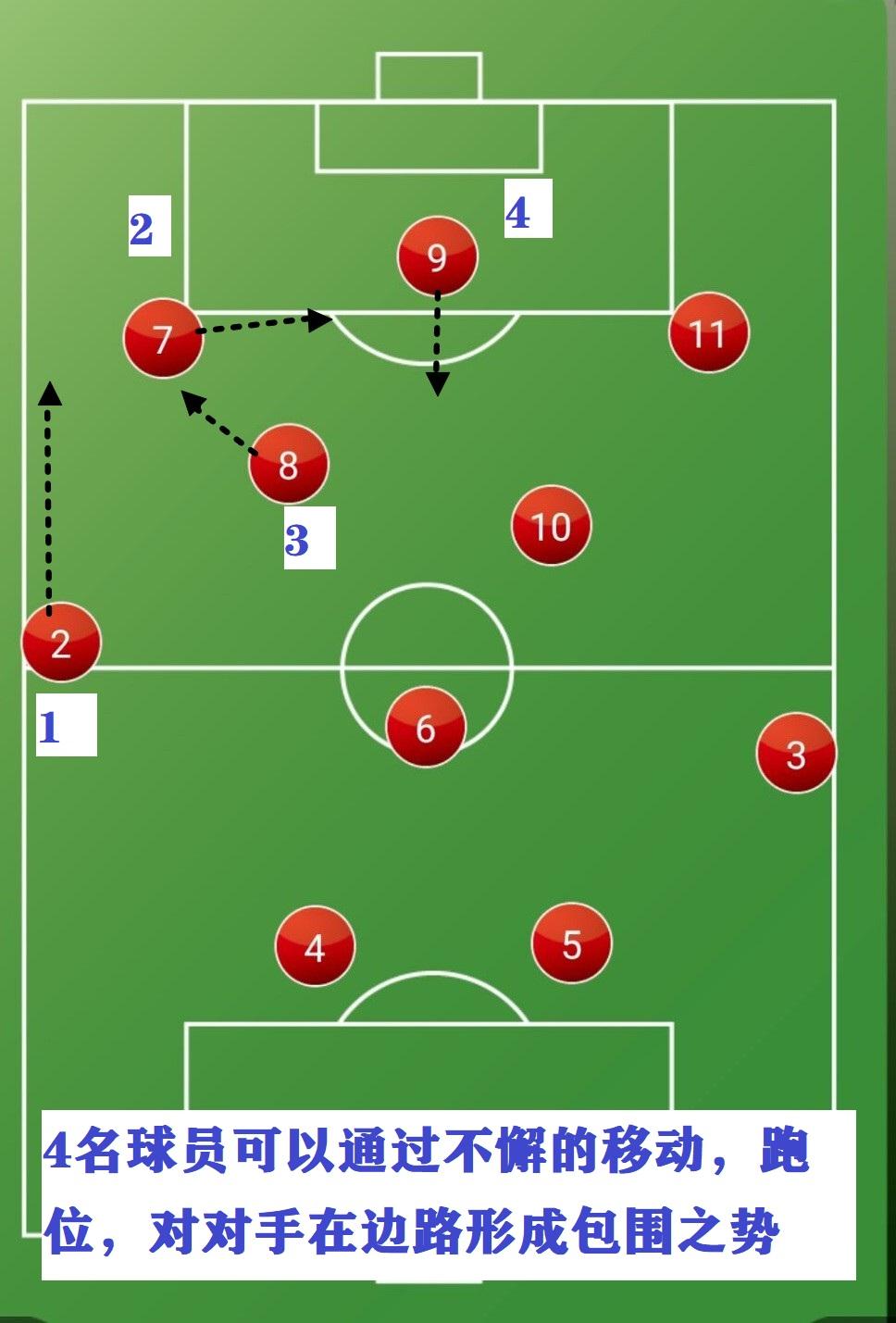 经过这样的轮转,我们看到球队在边肋区域可以对对手形成包围。这里的包围不仅体现在人数上的优势,更重要的是球员对战术理解的灵活性与跑位的多样性。