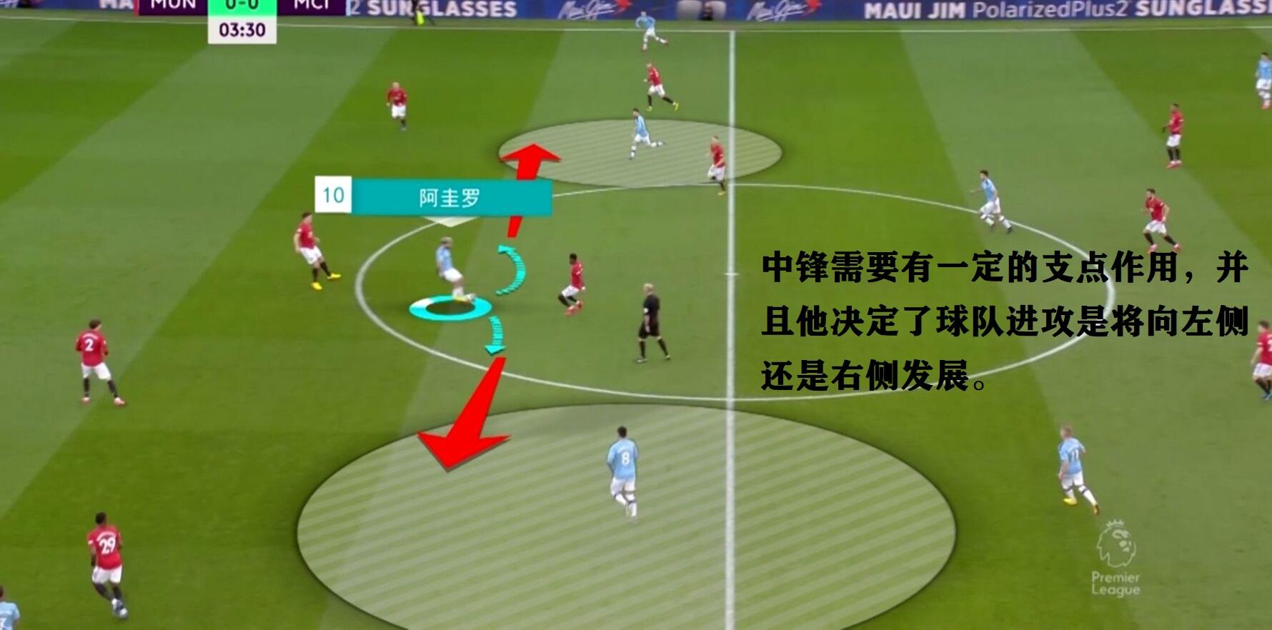 脚下技术出色, 需要充分参与到球队的传球配合过程中。需要有一定的支点作用 ,当球队在边路无法将对手的防线撕扯开始时,中场球员会将球传给中锋,由中锋再一次将球分向左右两边。(如下图所示)活动范围广 ,“横移,回撤”是中锋必备的移动思路。拥有敏锐的嗅觉及把握机会的能力。曼城球员阿圭罗脚下技术出色且具有一定的支点作用