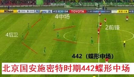 在中超联赛范围内,北京国安的人员储备及球员实力水平都属于一流水平,因此德国人施密特有“本钱”选择4-4-2蝶形中场这套偏向进攻的阵型作为自己的首选阵型。
