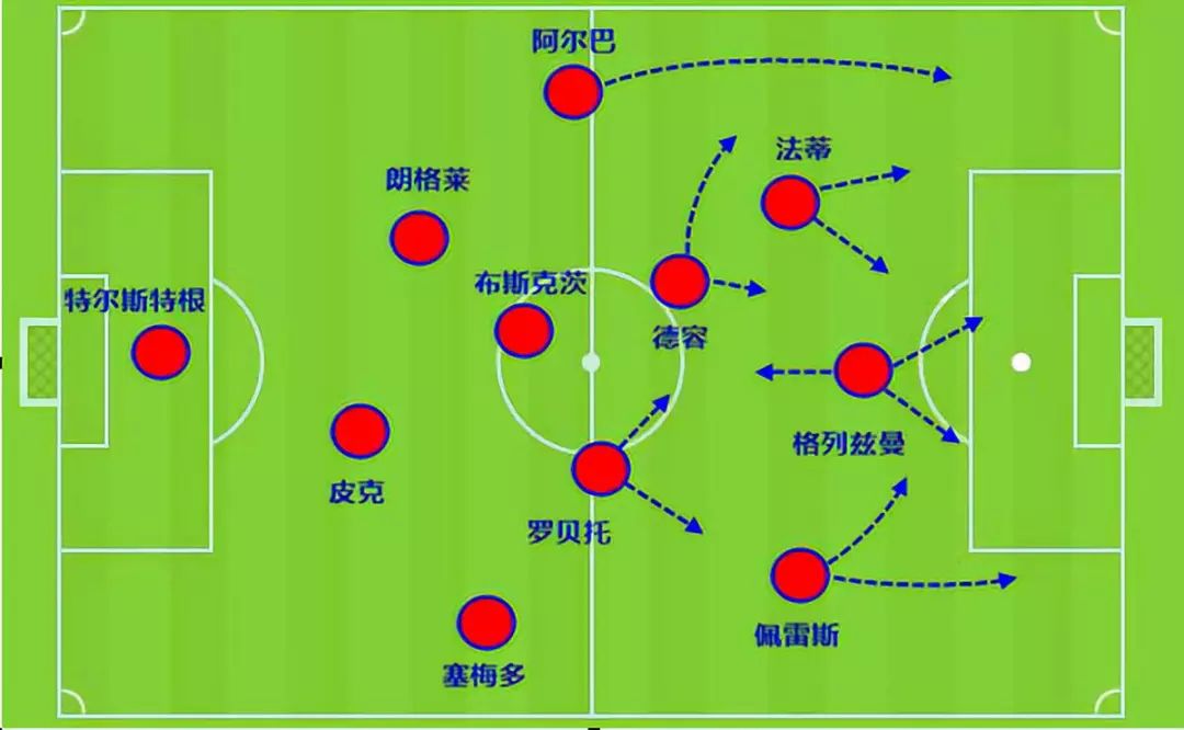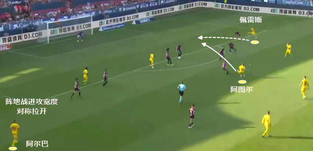 从上图可以看到,客场对阵奥萨苏纳的比赛中,两次送出助攻的佩雷斯,几乎在最后时刻完成绝杀。他在禁区右侧的位置完成漂亮的无球空切,可惜接应到阿图尔的妙传直面门将时,没能把握住射门机会。佩雷斯和阿尔巴左右对称,是巴萨阵地战破防的新尝试。