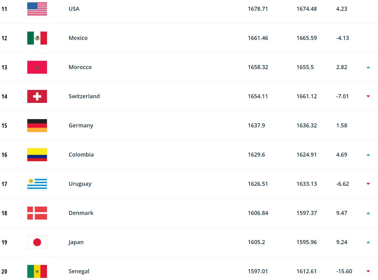 前十中葡萄牙升至第八,意大利则掉至第九。德国依然排在第15,日本则上升一名排在第19。