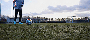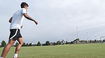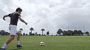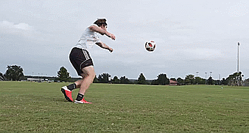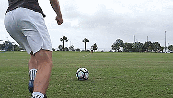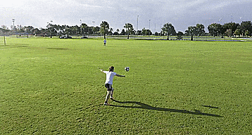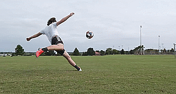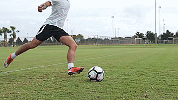 我们在踢过顶长传时,需要转动我们的脚踝,用脚背击打球底。
