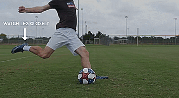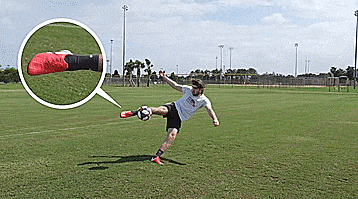 我们要用脚的最上面的部分击球,击打球的正中下方,如果我们打得太低,从下面切球,就会产生很多下旋,它会直接飞到空中。同样,我们的击球位置也不能太高,否则我们会把它踢到地面上,这样也没意义。