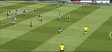 此外,如果我们想打一脚穿透球,有时一个小的弧线更容易实现目的。