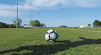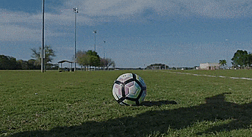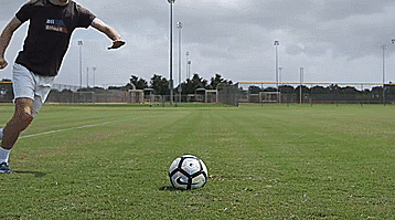 然后我们要击打球的正中间向下一点的位置,以确保能踢出回旋,直接击打中间同时也不会造成任何转向。