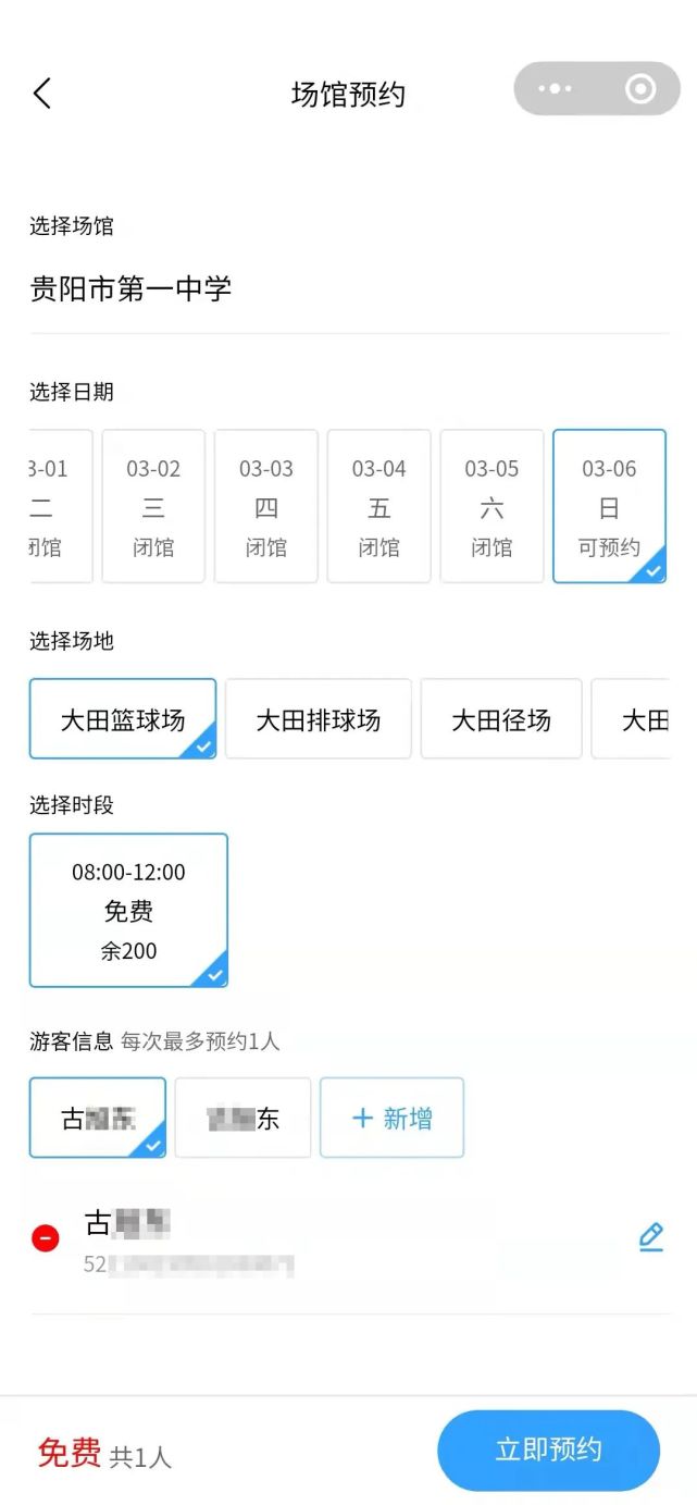 五【场馆预约】页面,市民可根据实际需求,选择该校的日期、场地、时段,添加常用游客信息(姓名、手机号、身份证号),点击右下角【立即预约】按钮