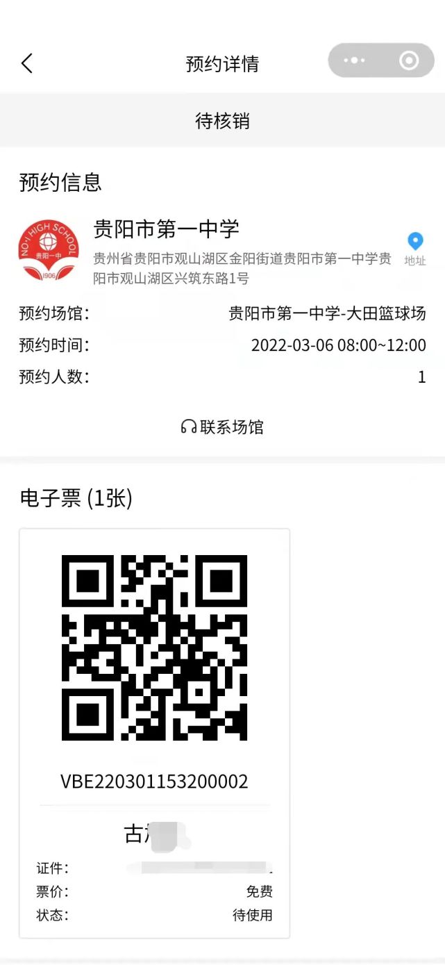 注: 该电子票作为体育场馆入场线上预约的唯一证明,请市民妥善保管。市民前往目标预约场馆进行线下核销后,方可进入场馆进行锻炼。