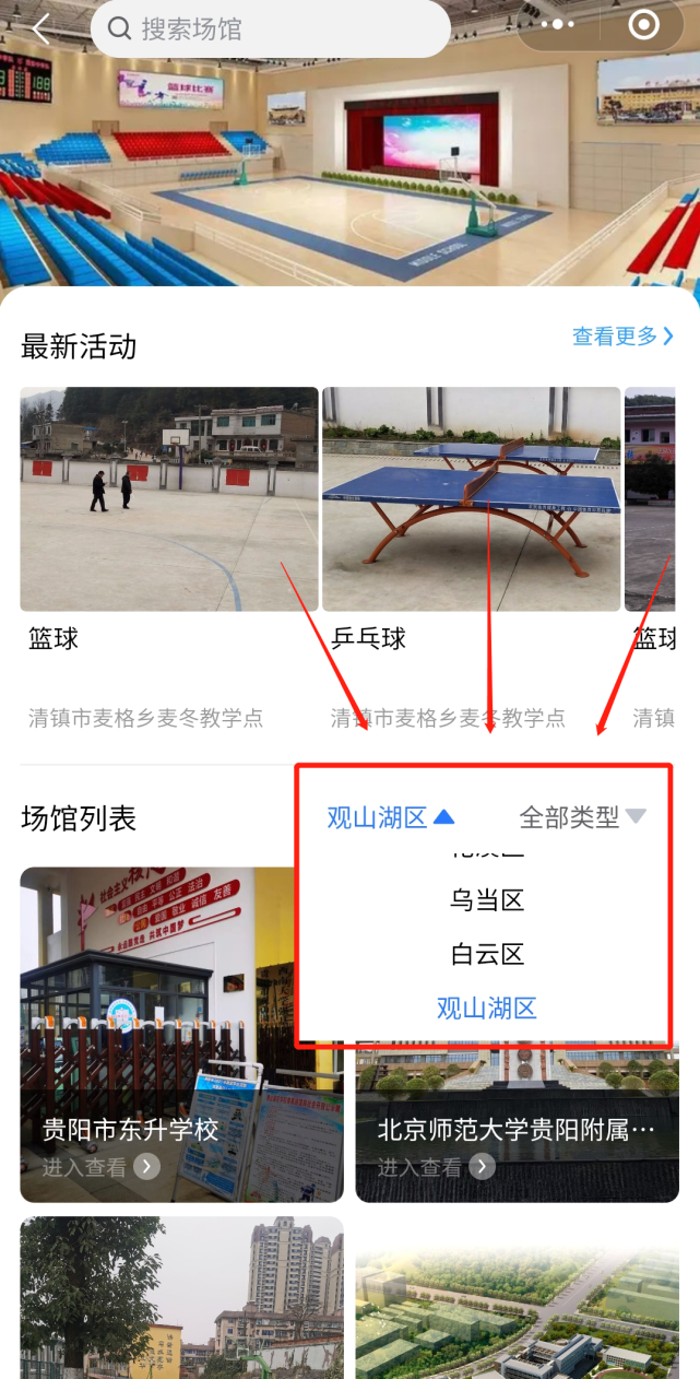 三、 在【学校场馆】 页面能看到全市学校体育场馆开放列表,以贵阳市第一中学为例,在场馆列表处点击下划按钮,选择学校所在行政区域【观山湖区】 ,再点击上方【搜索场馆】 就能精准找到市民的意向学校
