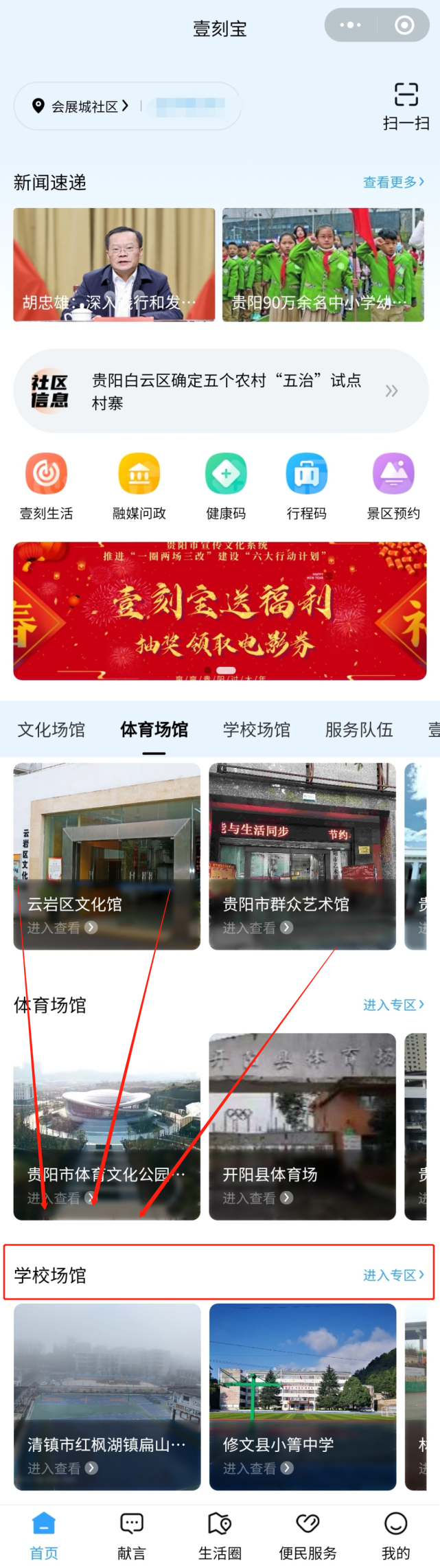 二、在【壹刻宝】平台首页,找到【学校场馆】板块,点击进入专区