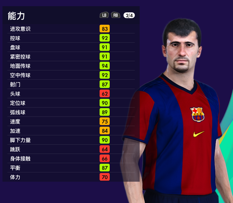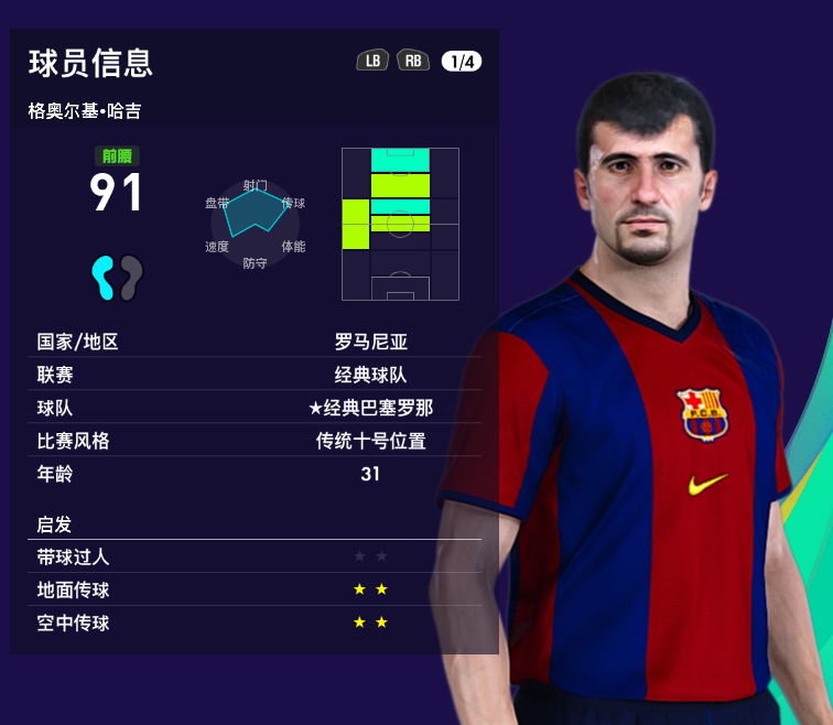 游戏中哈吉的数值还是很不错的,头球跳跃和体力稍低。进攻关键数据传球、控球、射门、任意球等都属顶级,还是很不错的一张牌,隶属【经典巴塞罗那】。